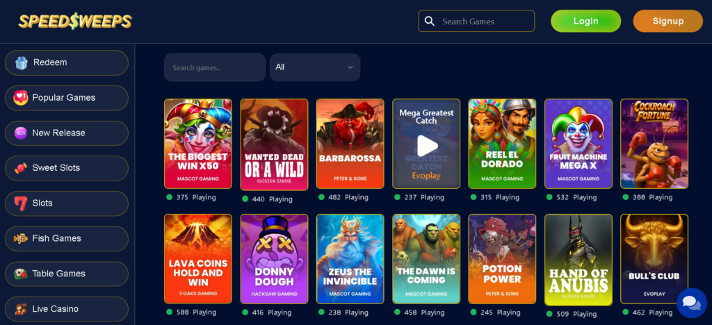 SpeedSweeps offers over 1,300 games, including slot games, table-style games, and live dealer–inspired titles. Slot games range from classic three-reel slots to modern video slots with bonus features. Table games include blackjack-style games, roulette variants, and poker-inspired options. The large game library ensures variety for both casual and experienced players.